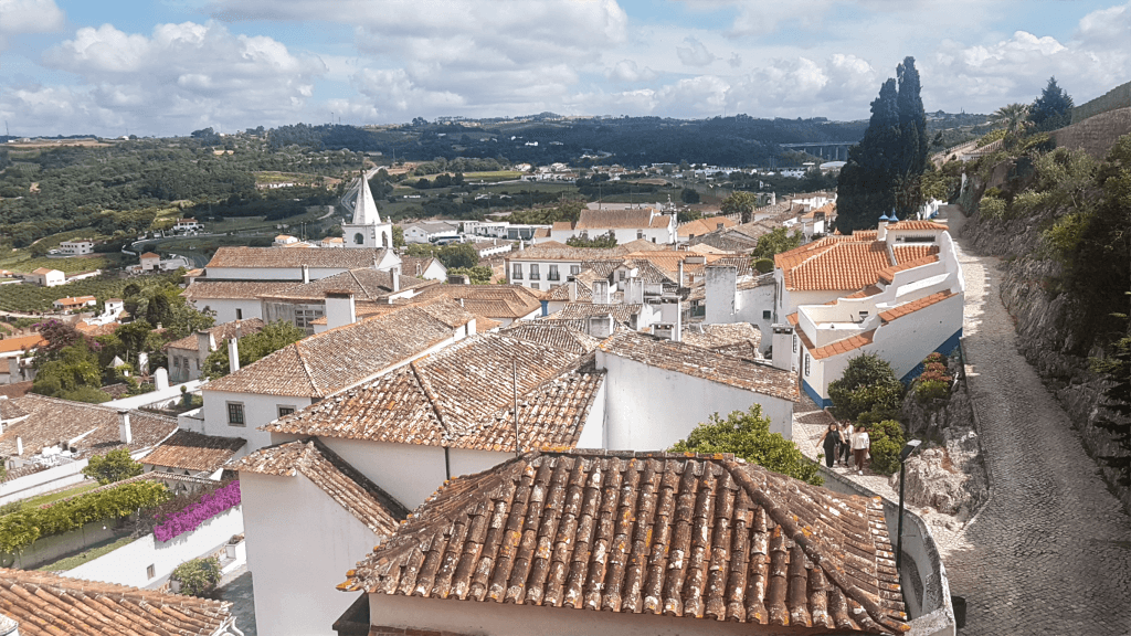 Zwiedzanie miasta najlepiej rozpocząć od wejścia przez piękną historyczną bramę Porta da Villa bogato zdobioną płytkami azulejos. Po przekroczeniu bramy wchodzimy w gąszcz bielonych budynków, których krawędzie pomalowane są niebieską farb. Jest to charakterystyczny element tradycyjnego budownictwa w Portugalii. Spacer wąskimi brukowanymi uliczkami jest jedną z największych atrakcji, bo wśród zabytkowych domów można odkryć prawdziwe perełki. Znajdziemy tam też mnóstwo ciekawych sklepików z pamiątkami i rękodziełem, gdzie polecam zaopatrzyć się w butelkę lokalnej wiśniówki.